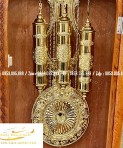 Phần thân đồng hồ thường được thiết kế theo kiểu dáng tủ đứng, có chân vững chãi và phần đỉnh mái uốn cong tinh tế. Mặt đồng hồ được mạ vàng hoặc đồng sáng bóng, kết hợp với kim giờ và số nổi bật, mang lại sự sang trọng, dễ nhìn.