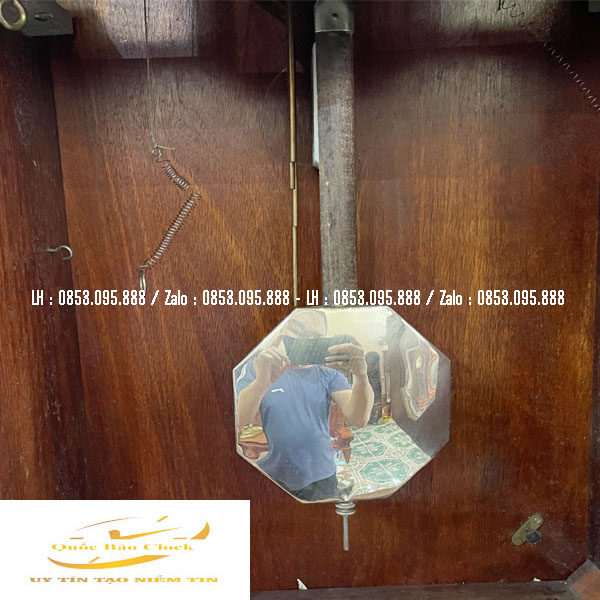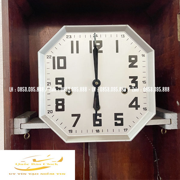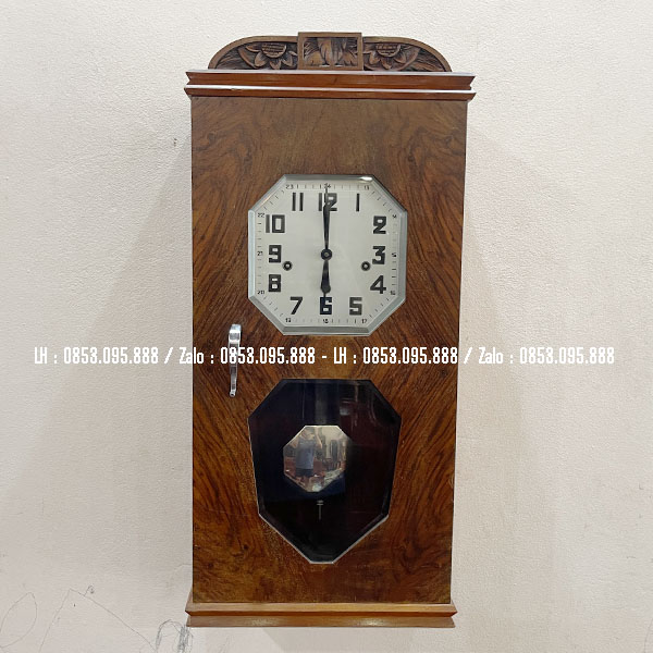 Kiểu dáng: Đồng hồ treo tường dạng hộp đứng, mặt số hình bát giác đặc trưng, đi kèm quả lắc phía dưới.