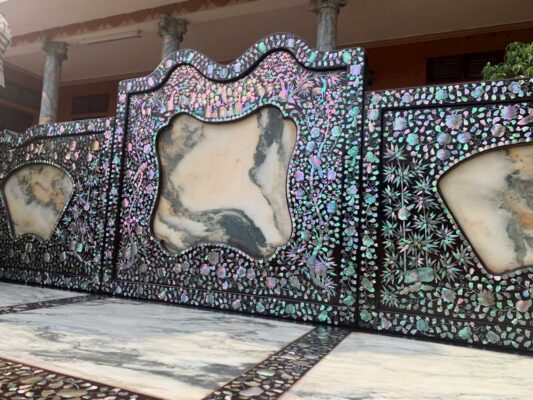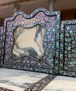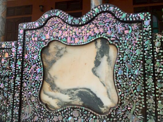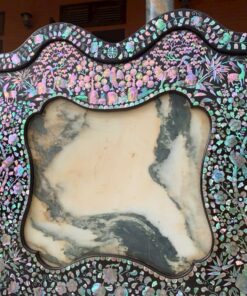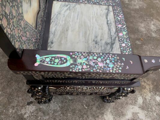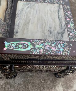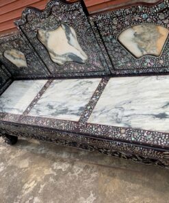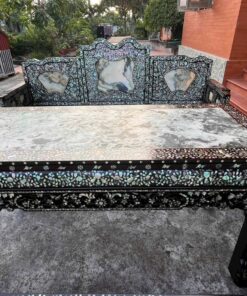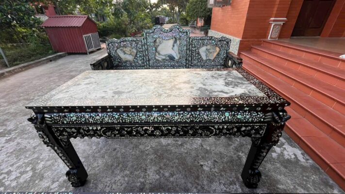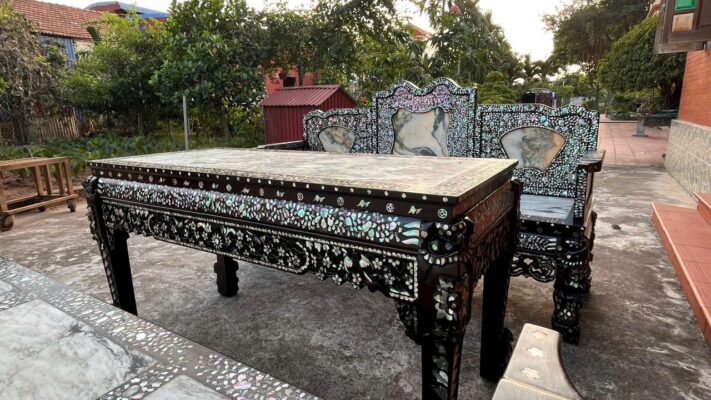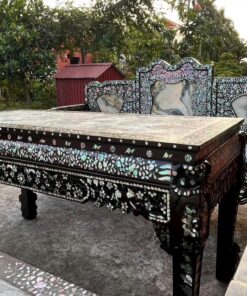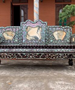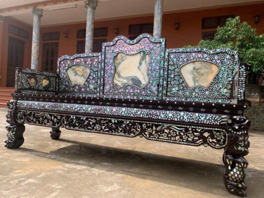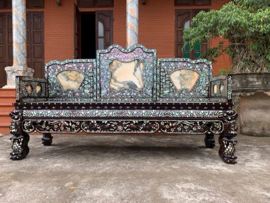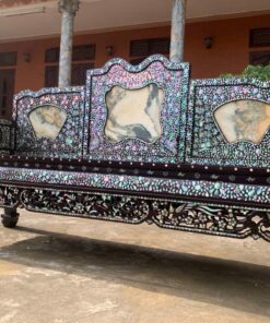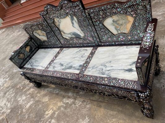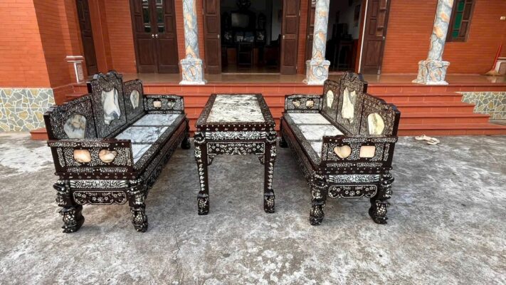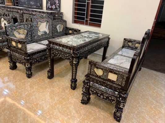 Trường tam sơn khảm ốc đỏ 4 món : 2 nghế văng , 1 bàn , 1 đôn Chất liệu gỗ gụ khảm ốc Singapo đỏ lửa